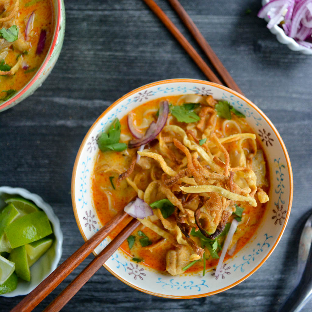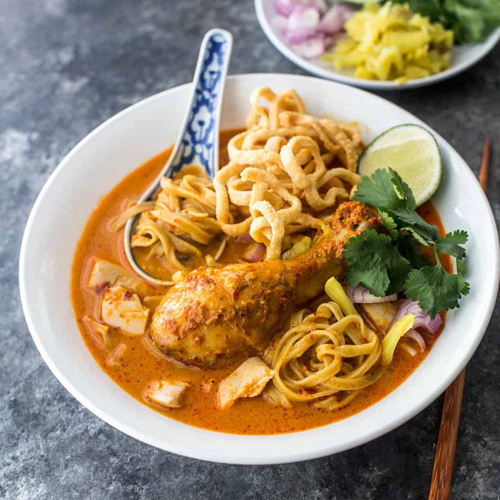 A rich flavorful Thai coconut curry noodles soup topped with crispy fried egg noodles, chopped shallots, pickle mustard green, lime wedges and chicken.