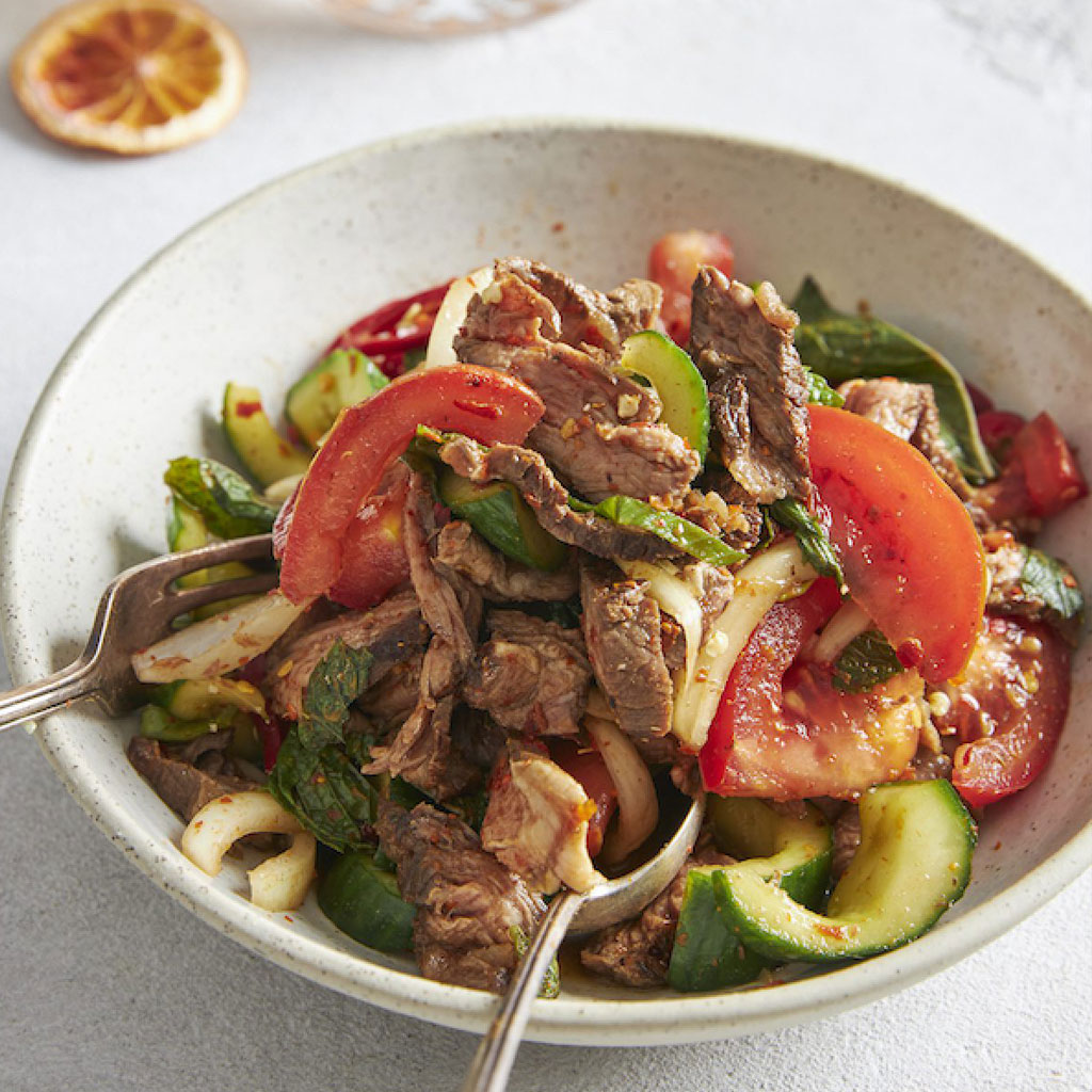 Grilled beef tenderloin, cucumbers, tomatoes, onion, cilantro, mint and chili lime dressing.