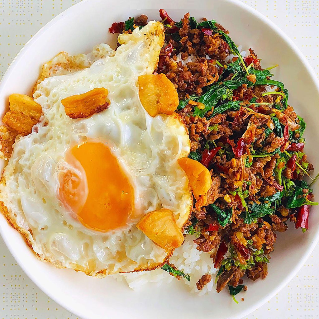 Thai’s favorite dish. Mince chicken or pork with chili & holy basil, served over steamed rice with fried egg and Thai chili fish sauce.