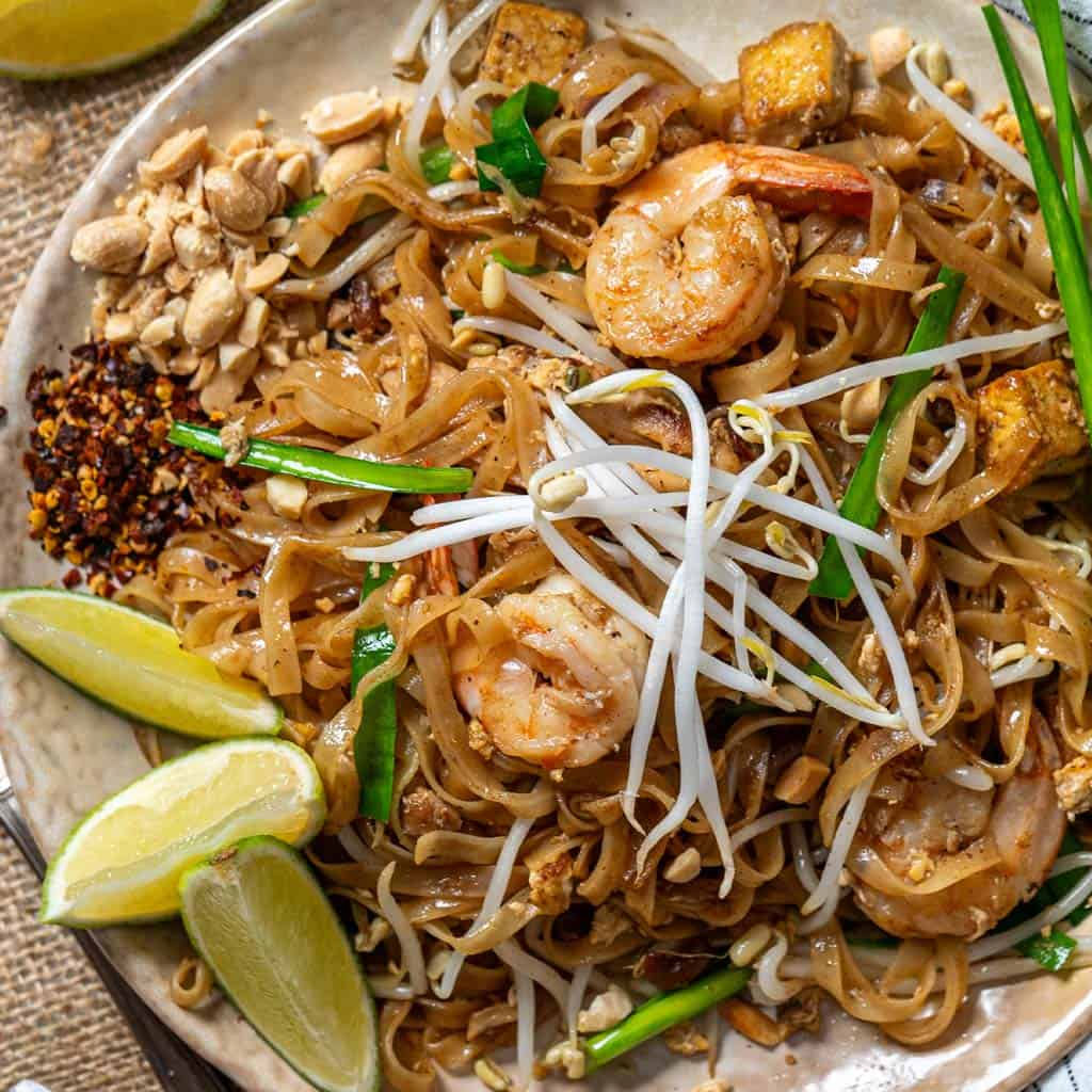 Thailand famous Pad Thai noodles, protein option; shallots, green onion, beansprouts and egg.